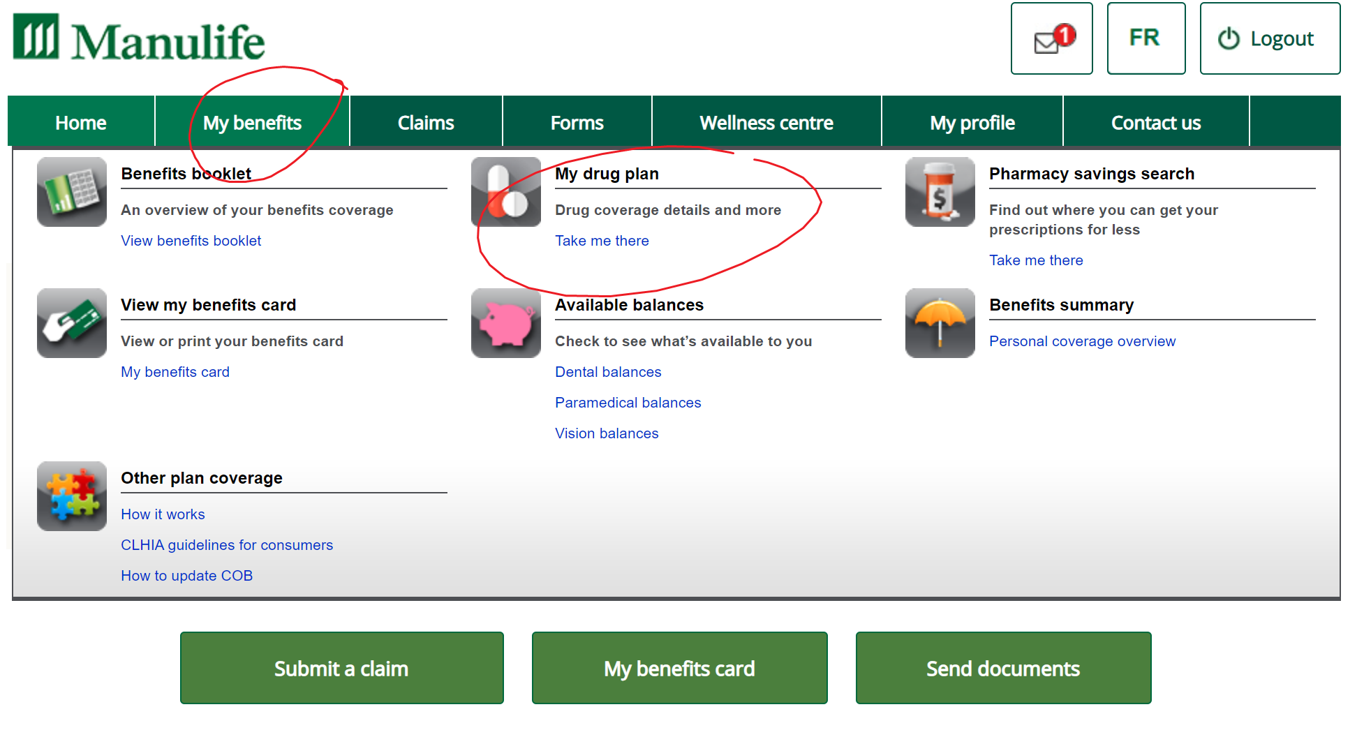 Not sure if your drug is covered? You can check online ahead of time to save yourself headaches at the pharmacy counter! Step 1) Sign onto your Manulife insurance account. If you haven’t yet signed up for a Manulife account, you’ll need to register for one, using the information on your Manulife insurance card (Group #, Policy #) Step 2) Hover your mouse over “My Benefits,” then click on “Drug coverage details and more” (see image below)